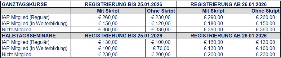 Mitglieder der Deutschen Abteilung der IAP erhalten zusätzlich das digitale Skript und die begleitende Lehrserie in ihren „Meine IAP“- Ordner im Mitgliederbereich eingestellt – unabhängig davon, ob sie an der Präsenz- oder Live-Online-Veranstaltung teilnehmen.